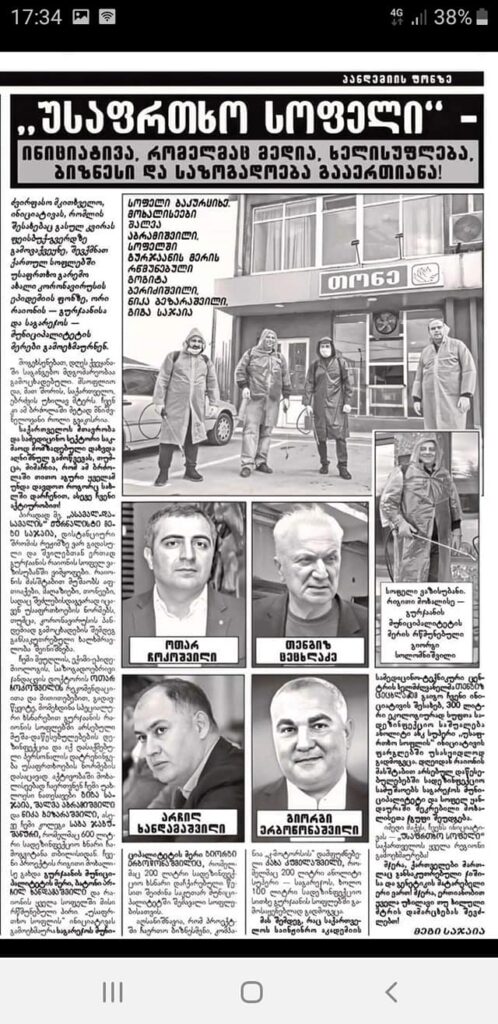 აღსანიშნავია რომ პირველ ეტაპზე პროექტს „უსაფრთხო სოფელი“ ბატონმა თენგიზ ცეცხლაძემ 200 ლიტრი ხსნარი გადასცა, ხოლო 100 ლიტრი სადეზინფექციო სითხე ჩვენი ინიციატივის წარმატებით განსახორციელებლად კომპანია „კ-მოტორსის“ დამფუძნებელმა კახა კუმელაშვილმა შეიძინა.